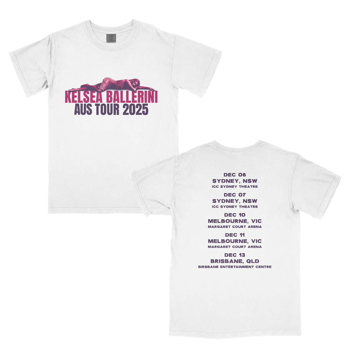 Kelsea Ballerini logo and Patterns portrait on front, Australia tour dates and cities on back printed on a white Comfort Colors tee.