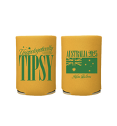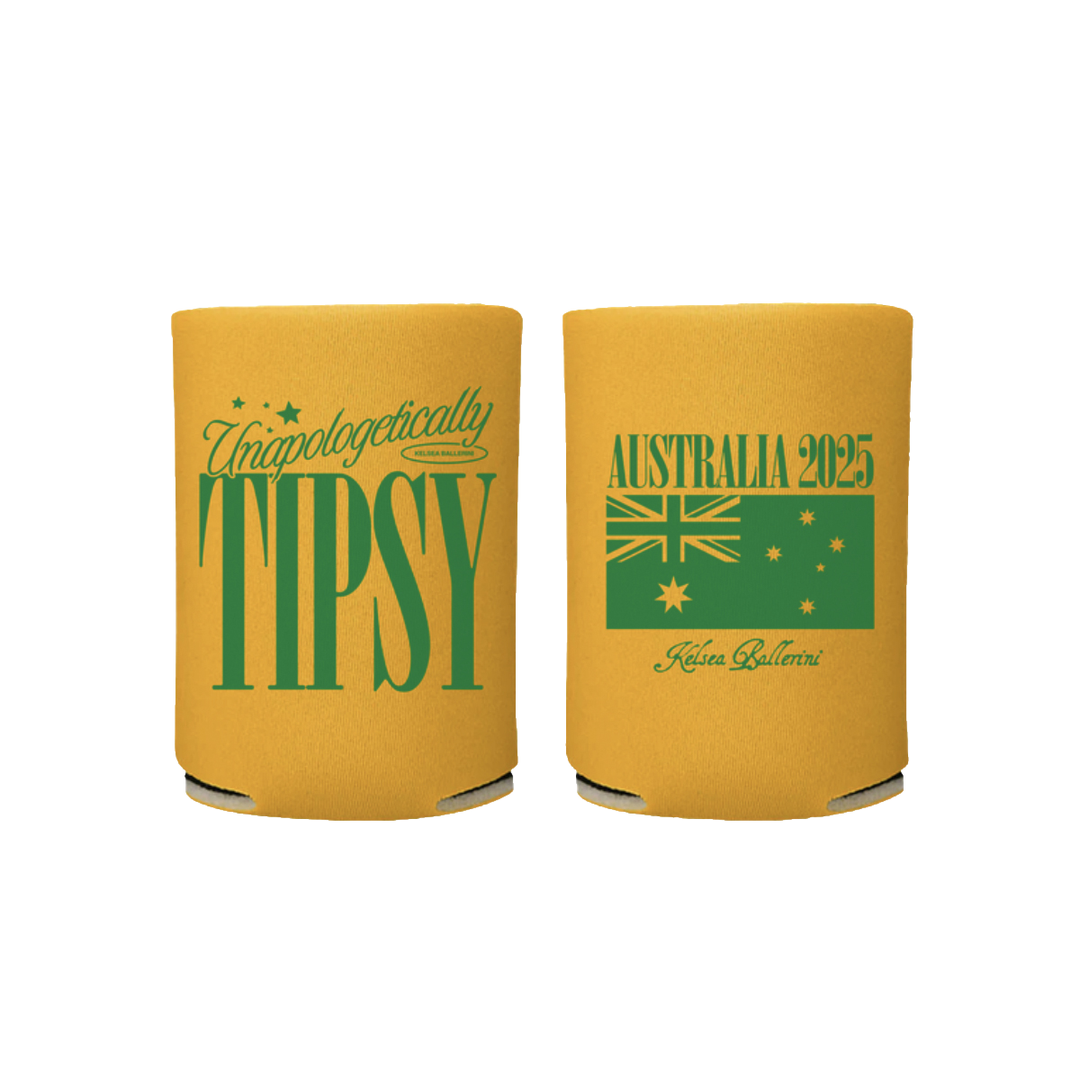 "Unapologetically Tipsy" on front, Australia 2025 featuring Australian flag and Kelsea Ballerini logo on back printed on a yellow can hugger.